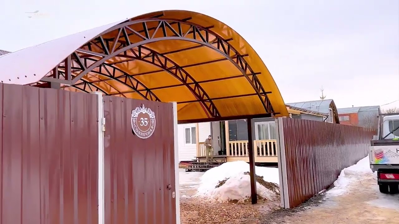 Навес из поликарбоната с правильным подъёмом арочной стропильной фермы шириной более 6-ти метров